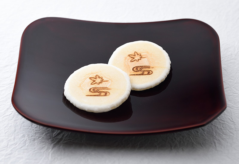 砂糖みつをひいた麩焼きせんべいです。季節の焼印を押しました。
