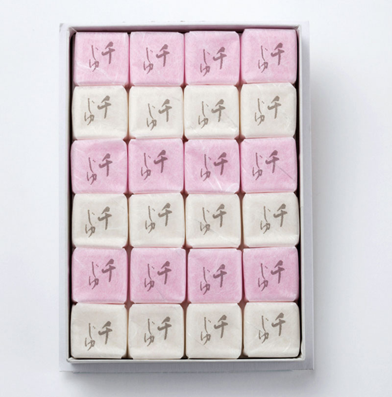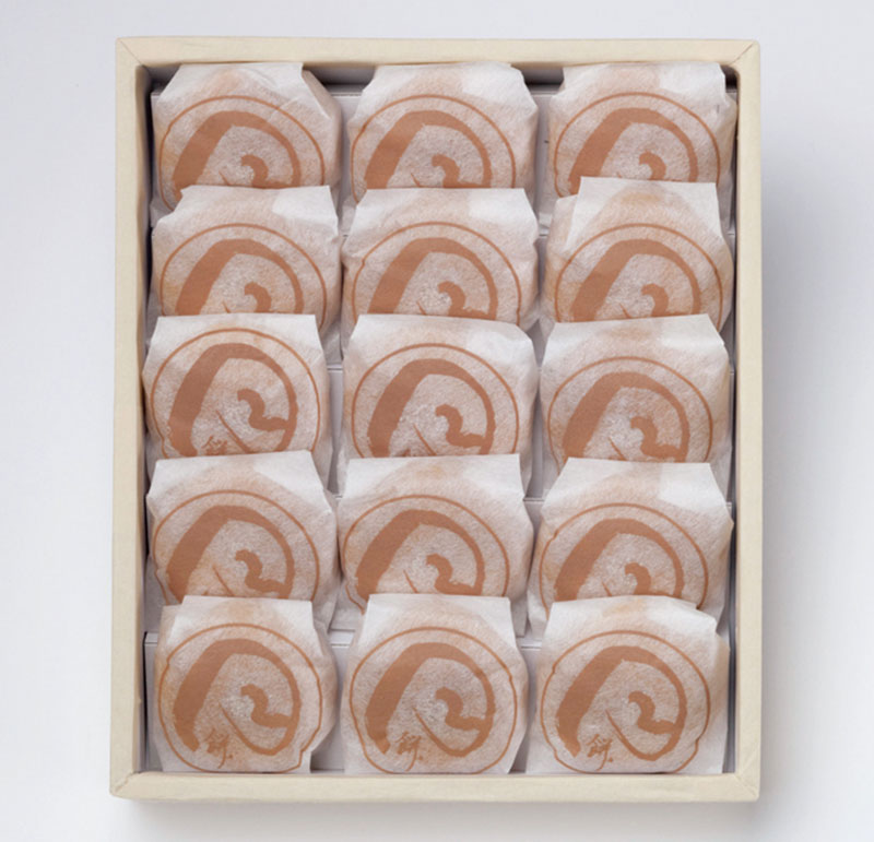 西陣織をモチーフに、羽二重餅の皮に黒胡麻入りのこしあんを巻き込みました。絹の生地をイメージしたなめらかな口当たりと、着物の反物を連想させる形が人気の代表銘菓。反物をなぞらえて、たとう紙を観世よりで結んだ包みも優雅で、贈り物にも最適です。