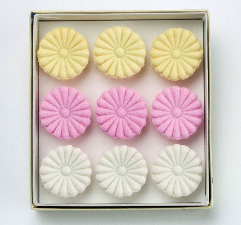 こしあんの入った、菊型の落雁を美しい三色で仕上げました。
