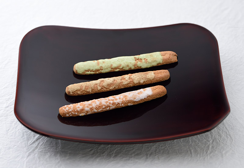 ぼうろを食べやすくスティック状にしました。砂糖みつ、抹茶みつ、黒砂糖の3つの味が楽しめます。