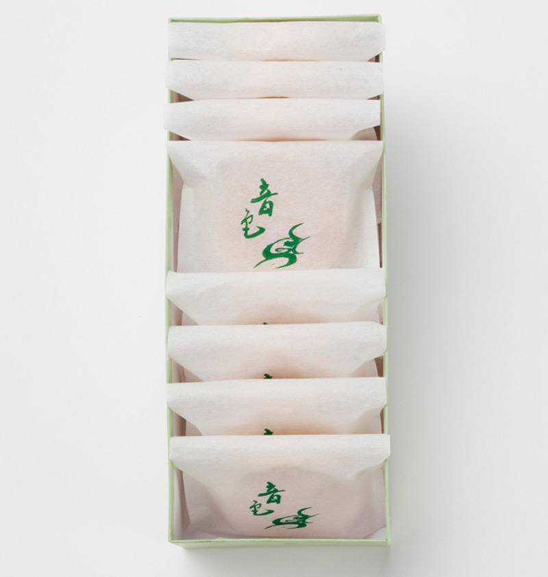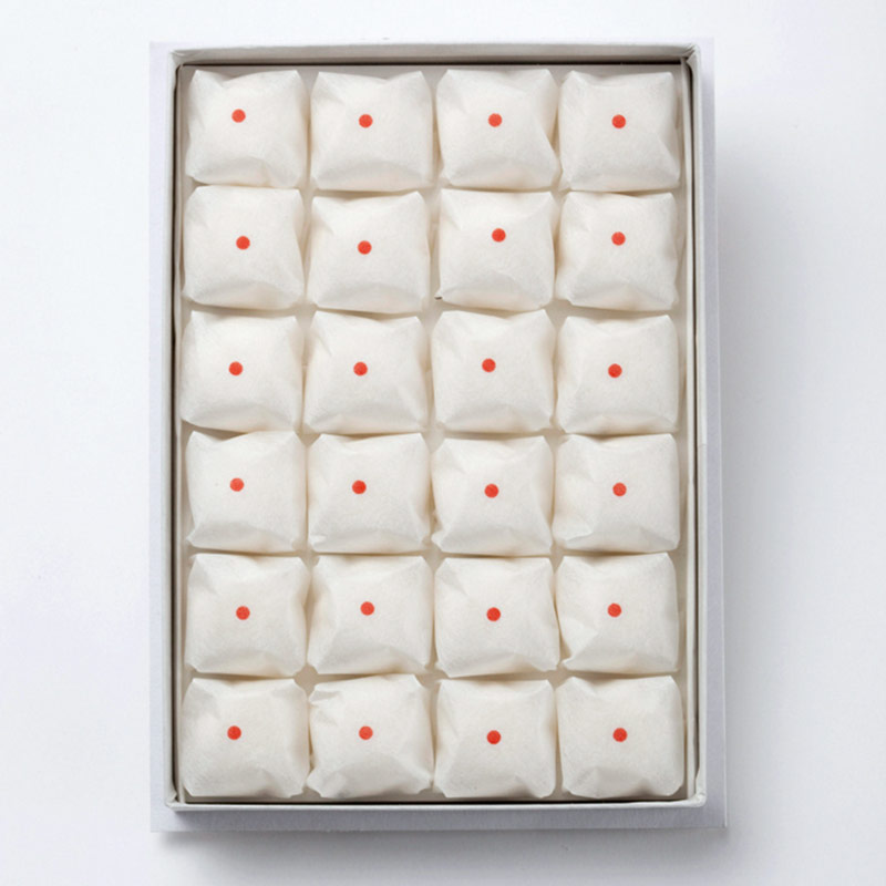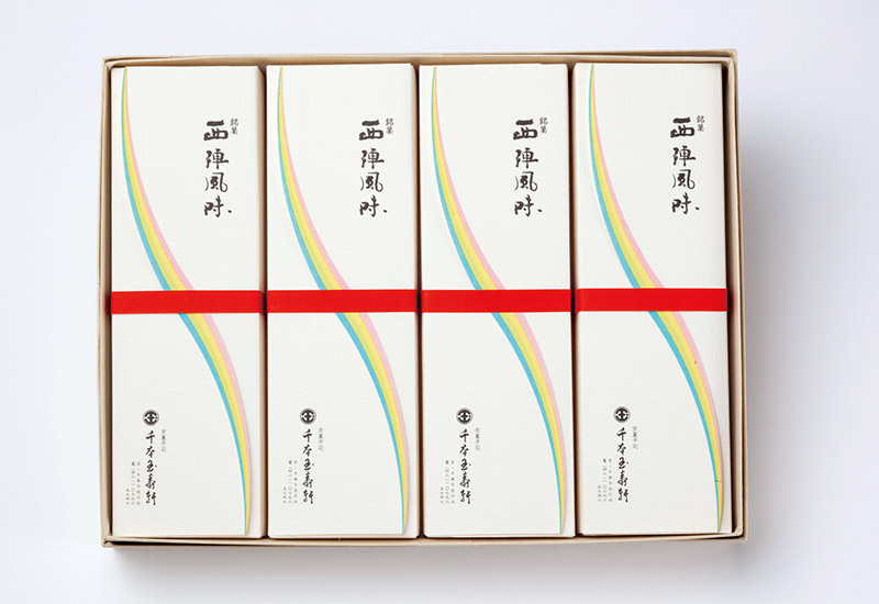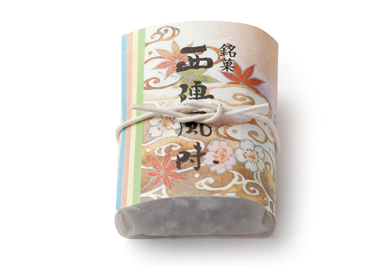 西陣織をモチーフに、羽二重餅の皮に黒胡麻入りのこしあんを巻き込みました。絹の生地をイメージしたなめらかな口当たりと、着物の反物を連想させる形が人気の代表銘菓。反物をなぞらえて、たとう紙を観世よりで結んだ包みも優雅で、贈り物にも最適です。