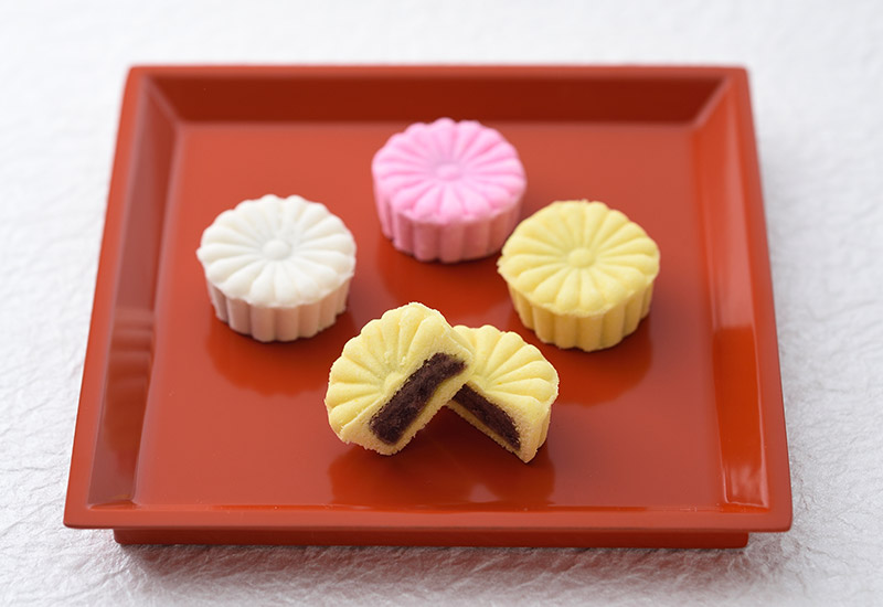 こしあんの入った、菊型の落雁を美しい三色で仕上げました。